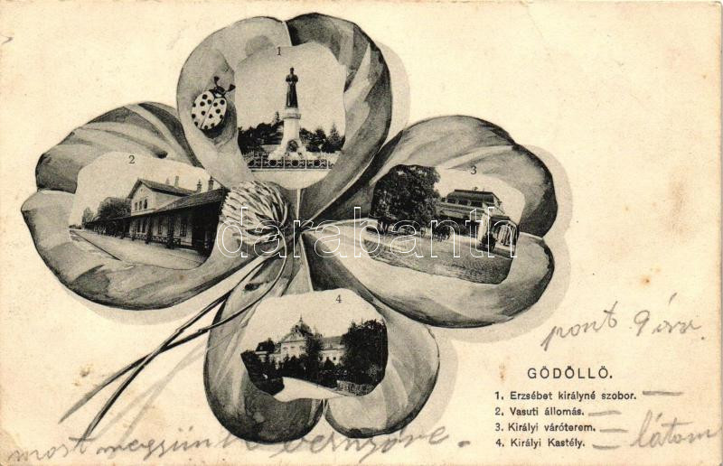 Beschreibung: Gödöllő, vasútállomás, Erzsébet királyné szobor, Királyi váróterem, lóhere (EK)