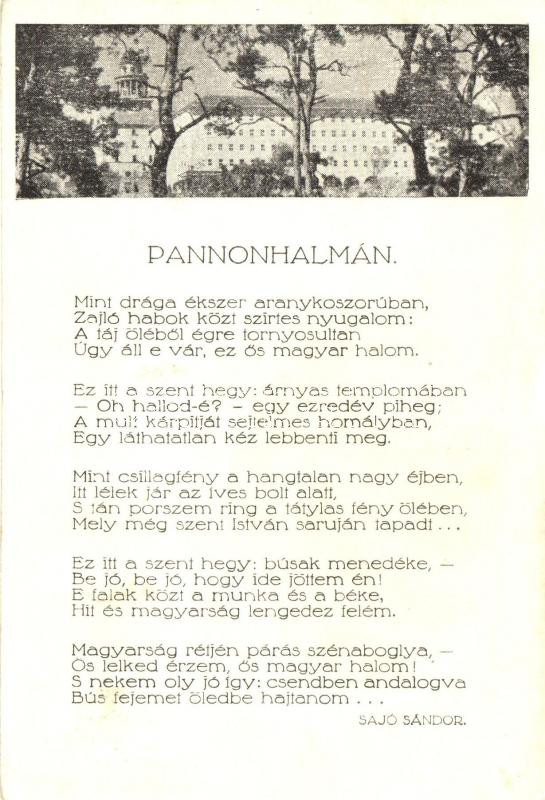 Pannonhalma, Főapátság, verses képeslap Sajó Sándor versével (EK) https://www.darabanth.com/de/262-Fernauktion/262.0/Ansichtskarten/Ungarn~100023/Pannonhalma-Foapatsag-verses-kepeslap-Sajo-Sandor-versevel-EK~II1297726