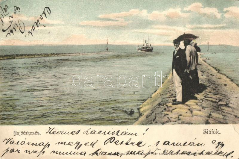 Beschreibung: Siófok, Hajóérkezés, móló. Ellinger Ede kiadása (kis szakadás / small tear)