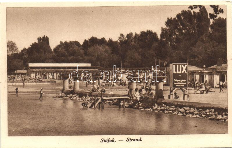 Siófok, Strand, fürdőzők, Lux selyemgyapjú reklám (EK) https://www.darabanth.com/de/262-Fernauktion/262.0/Ansichtskarten/Ungarn~100023/Siofok-Strand-furdozok-Lux-selyemgyapju-reklam-EK~II1301415