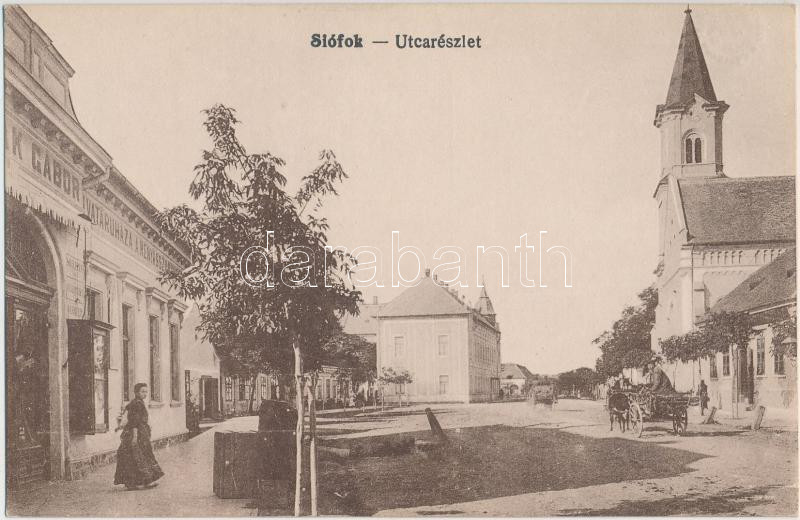 Siófok, Utcakép, divatáruház a menyasszonyhoz, templom https://www.darabanth.com/de/262-Fernauktion/262.0/Ansichtskarten/Ungarn~100023/Siofok-Utcakep-divataruhaz-a-menyasszonyhoz-templom~II1305706