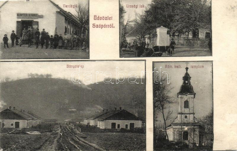 Szápár, Vendéglő, Urasági lak, Bányatelep, Római Katolikus templom (r) https://www.darabanth.com/de/262-Fernauktion/262.0/Ansichtskarten/Ungarn~100023/Szapar-Vendeglo-Urasagi-lak-Banyatelep-Romai-Katolikus-templom-r~II1303575