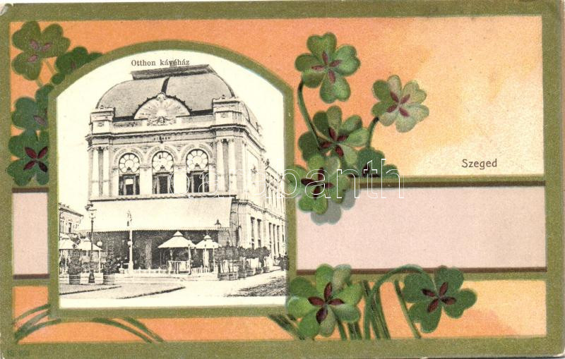 Szeged, Otthon kávéház, lóhere, Art Nouveau litho (EK) https://www.darabanth.com/de/262-Fernauktion/262.0/Ansichtskarten/Ungarn~100023/Szeged-Otthon-kavehaz-lohere-Art-Nouveau-litho-EK~II1303445