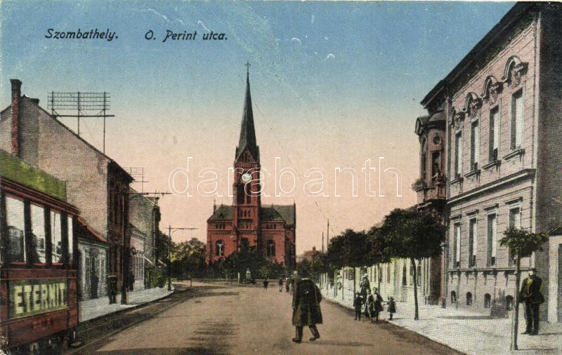 Szombathely, Ó. Perint utca, villamos, templom (EK) https://www.darabanth.com/de/262-Fernauktion/262.0/Ansichtskarten/Ungarn~100023/Szombathely-O-Perint-utca-villamos-templom-EK~II1287081