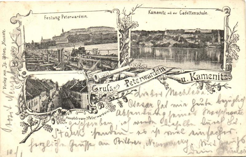 Beschreibung: Újvidék, Novi Sad; Pétervárad, Kamánc, kadétiskola, Fő út / fortress, Kamenitz, military school, main street, Ig. Urban floral