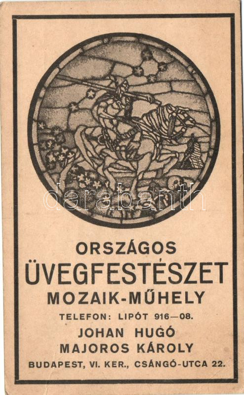 Budapest VI. Johan Hugó és Majoros Károly Országos Üvegfestészet Mozaik-Műhelye / Advertisment of Hugó Johan and Károly Majoros' glass painter shop (EK)