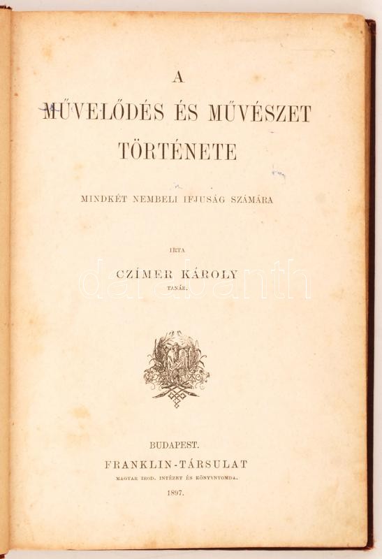 Czímer Károly: A művelődés és művészet története mindkét nembeli ifjúság számára. Bp. 1897. Franklin. 192 l. Aranyozott kiadói egészvászon-kötésben. Ajándékozási bejegyzéssel.