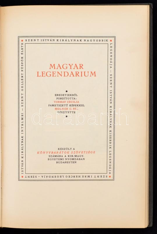 Magyar legendárium. Eredetiekből fordította: Tormay Cecilia, fametszetű képekkel Molnár C. Pál díszítette. Készült a Könyvbarátok Szövetsége számára.