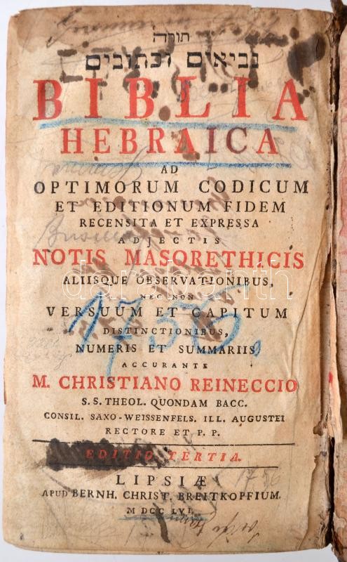 Biblia Hebraica ad optimorum codicum et editionum fidem recensita et expressa adjectis notis Masorethicis alisque observationibus, nec non versuum et capitum distinctionibus, numeris et summariis accurante M. Christiano Reineccio... [Lipcse] Lipsiae, 1756. Breitkopf. 516, 580 l. 2 sztl. lev. Korabeli egészbőr-kötésben, gerince sérült-hiányos. Számos helyen jegyzetek, beírások. / Original 3/4 calf-leather covered boards, with gold lettering and tooling on spine. Raised bands, all egdes are red. Considerable damage and some obvious loss on the spine. Major dark tannig on several pages, and pencilmarks also.