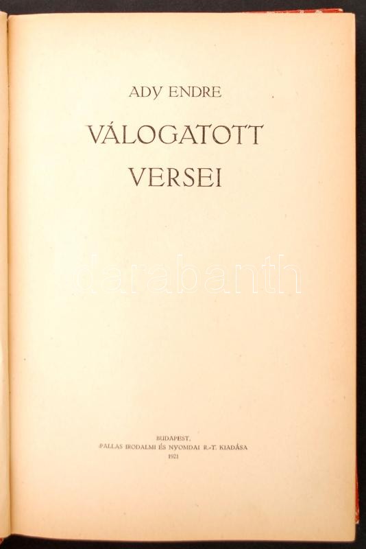 Ady Endre válogatott versei. (Válogatta Dóczy Jenő. Ill. Jaschik Álmos.) Bp. 1921. Pallas. Kiadói keménykötésben. A gerince sérült, ezt korábban amatőr ragasztással javították.