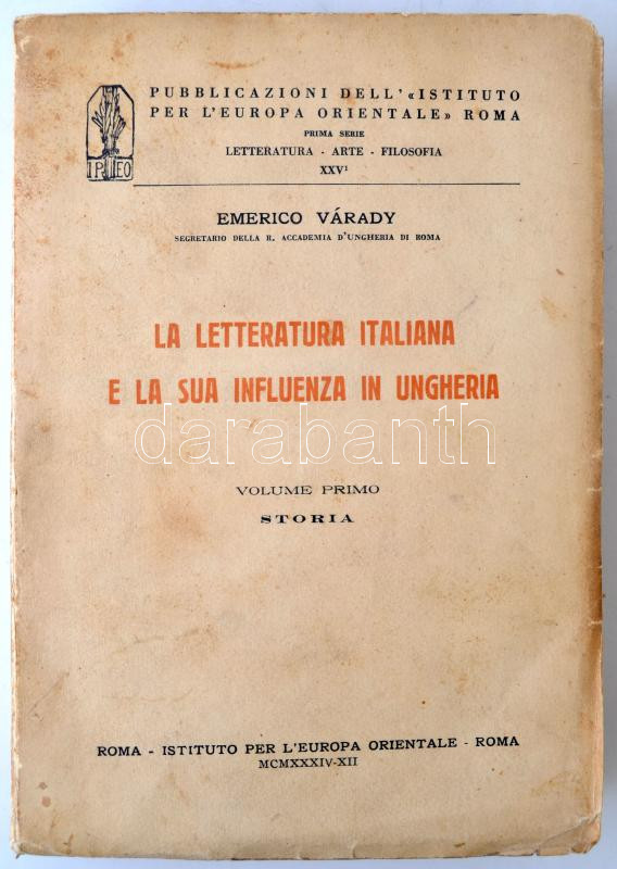 Emerico Várady: La letteratura Italiana e la sua influenza in Ungheria. Vol. 1. Roma, 1934, Istituto per l Europa Orientale. 497 p. Kiadói papírkötésben, néhol ceruzás aláhúzásokkal.