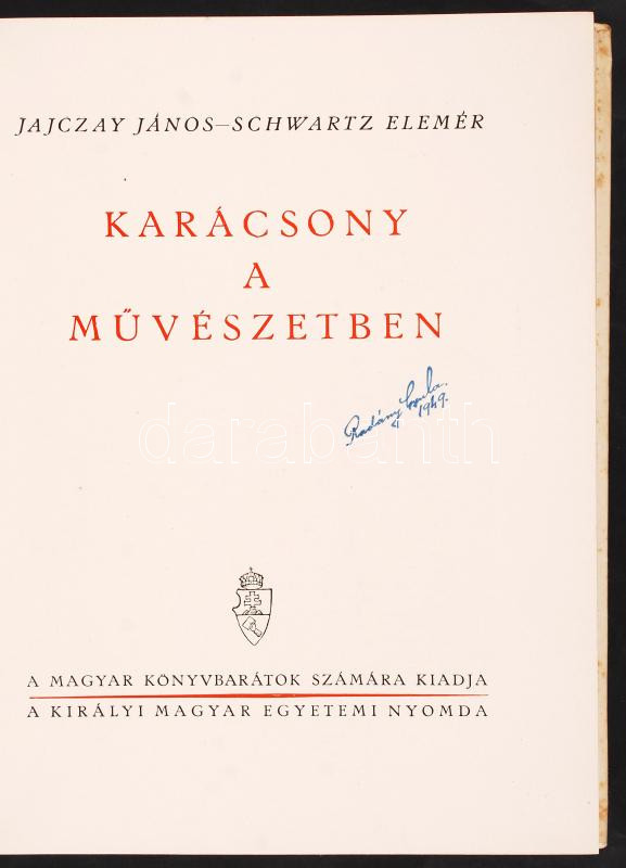 Jajczay János - Schwartz Elemér: Karácsony a művészetben Bp., 1942, Kir. M. Egyetemi Ny. 255p, CXXVIII t. lapszámozáson belül, szövegközti képekkel. Aranyozott gerincű kiadói félvászon kötésben.
