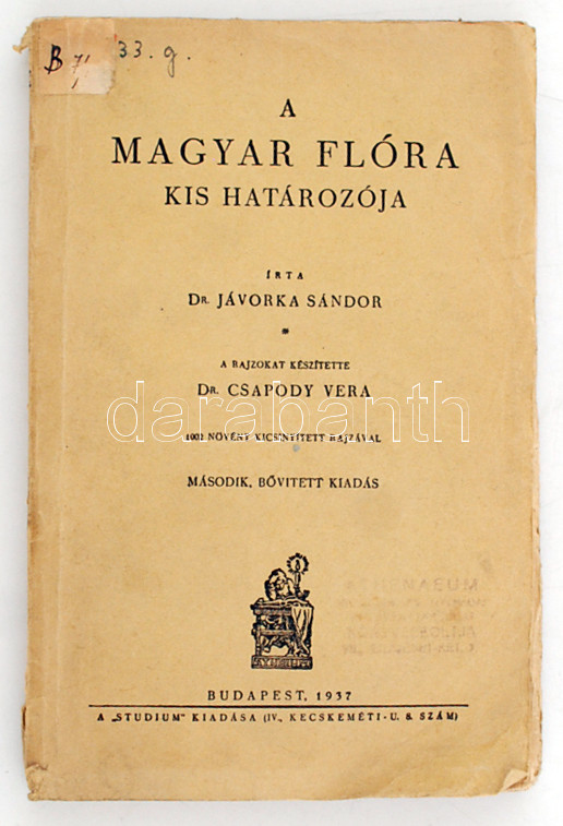 Dr. Jávorka Sándor: A magyar flóra kis határozója. A rajzokat készítette Csapody Vera. 1002 növény kicsinyített rajzával. Második, bőv. kiadás. Bp., 1937, Studium. Kiadói papírkötésben.