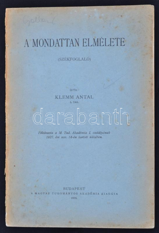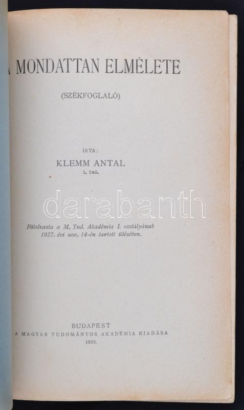 Klemm Antal: A mondattan elmélete. (székfoglaló) Bp., 1928, MTA. Kiadó... https://www.darabanth.com/de/262-Fernauktion/262.0/Bucher/Bucher-Wissenschaft-und-Technik~35/Klemm-Antal-A-mondattan-elmelete-szekfoglalo-Bp-1928-MTA-Kiadoi-papirkotesben-a-geri~II1258324