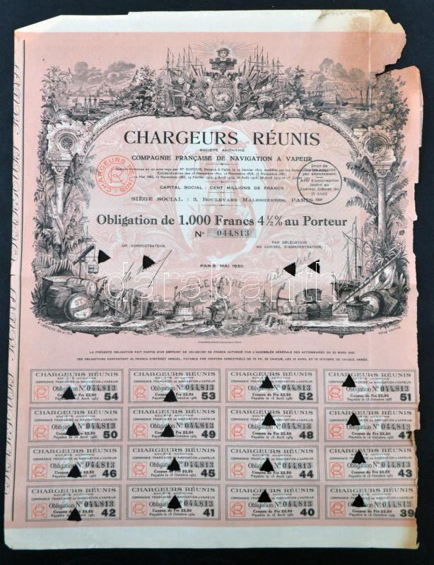 Franciaország / Párizs 1930. "Chargeurs Réunis Gőzhajózási Részvé... https://www.darabanth.com/de/262-Fernauktion/262.0/Numismatik/Aktien-und-Tickets~200006/Franciaorszag-Parizs-1930-Chargeurs-Reunis-Gozhajozasi-Reszvenytarsasag-kotvenye-10~II1303217