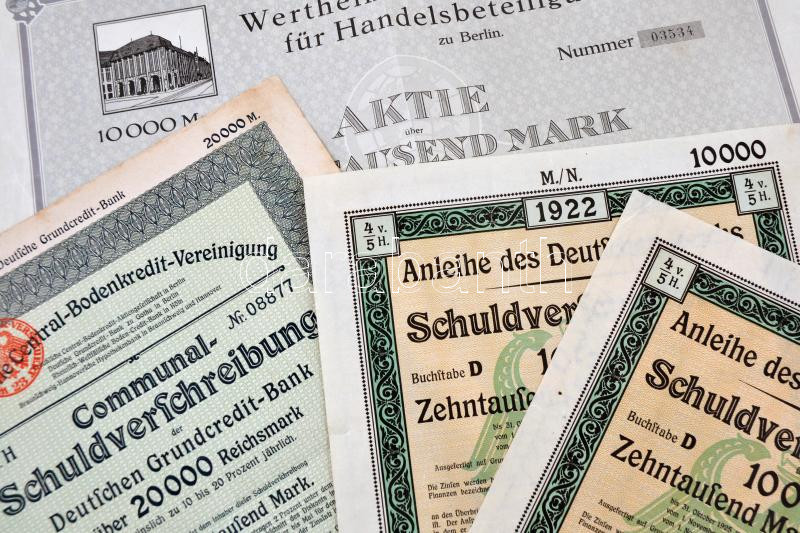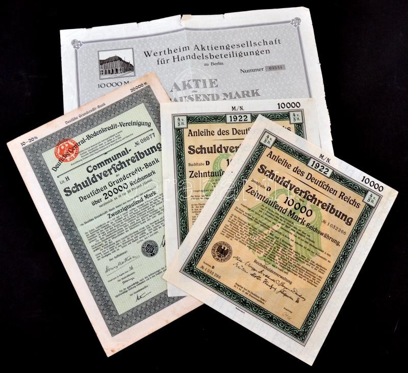 Germany / Weimar Republic 1922-1923. 4pcs of shares, with Berlin 1922. "Bond of the German Empire" debenture bond about 10.000 Mark C:VF,F