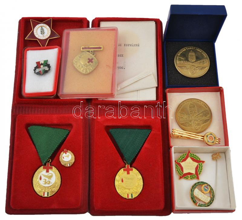 10db-os szocialista jelvény és érem tétel, benne "Kiváló Társadalmi Munkáért", "Kiváló Dolgozó", "MÁV 160 éve a haladás szolgálatában", "Véradásért", "Szocialista Kultúráért", "Törzsgárda" T:vegyes