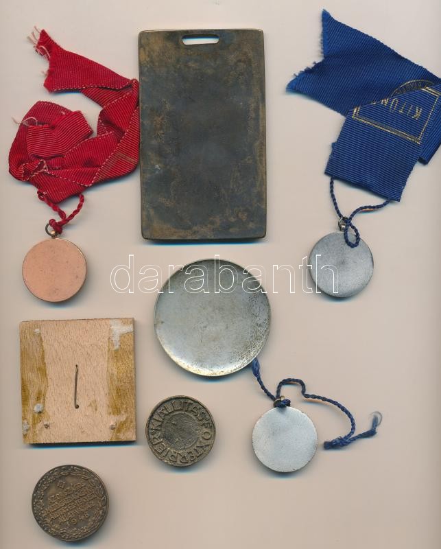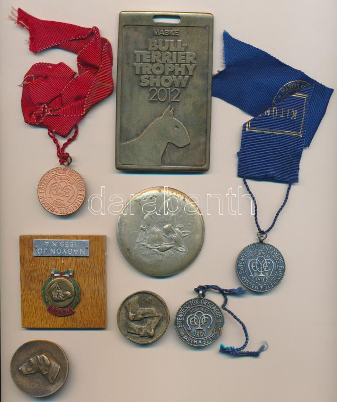 10db-os vegyes magyar és külföldi ebtenyésztéssel foglalkozó érem, több szalagon, közte 1948. "Az Országos Mezőgadasági Kiállítás és Tenyészállat Várás 1948" Br emlékérem (36mm); 1959. "MKOE (Magyar Kutyatenyésztők Országos Egyesülete) - Nagyon Jó" részben zománcozott Br díjérem fatalpon, tokban (érem mérete 24x29mm) T:vegyes