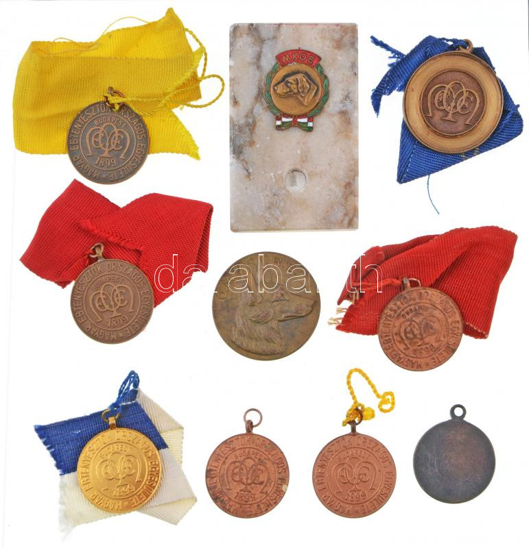 10db-os vegyes magyar és külföldi ebtenyésztéssel foglalkozó érem, több szalagon, közte DN "MKOE (Magyar Kutyatenyésztők Országos Egyesülete)" részben zománcozott Br díjérem márványlapon, kis fémtábla hiányzik róla (érem mérete 24x29mm); "Országos CAC Kutyakiállítás - MEOE Gyöngyös" Br érem füllel (30mm) T:vegyes
