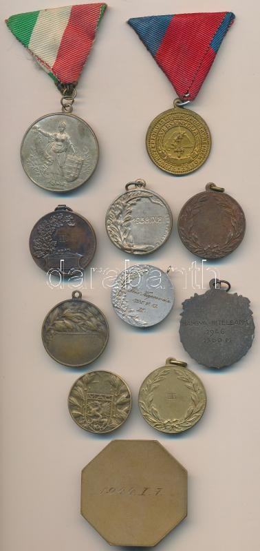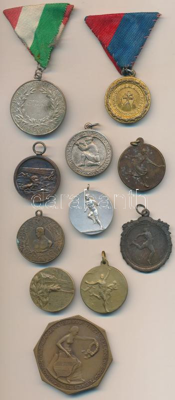 11db-os vegyes magyar sportérem és emlékérem tétel, közte Zombori Kiss István (1902-1953) 1941. "Magyar Általános Hitelbank Tisztviselőinek Sportegylete 1912" Br díjérem (46mm); ~1930. "Középfokú Iskolák Sportköreinek Országos Szövetsége Versenydíja / Dulce et decorum est pro patria mori (Édes és dicső dolog a hazáért meghalni)" aranyozott Br díjérem mellszalagon (40,5mm) T:vegyes