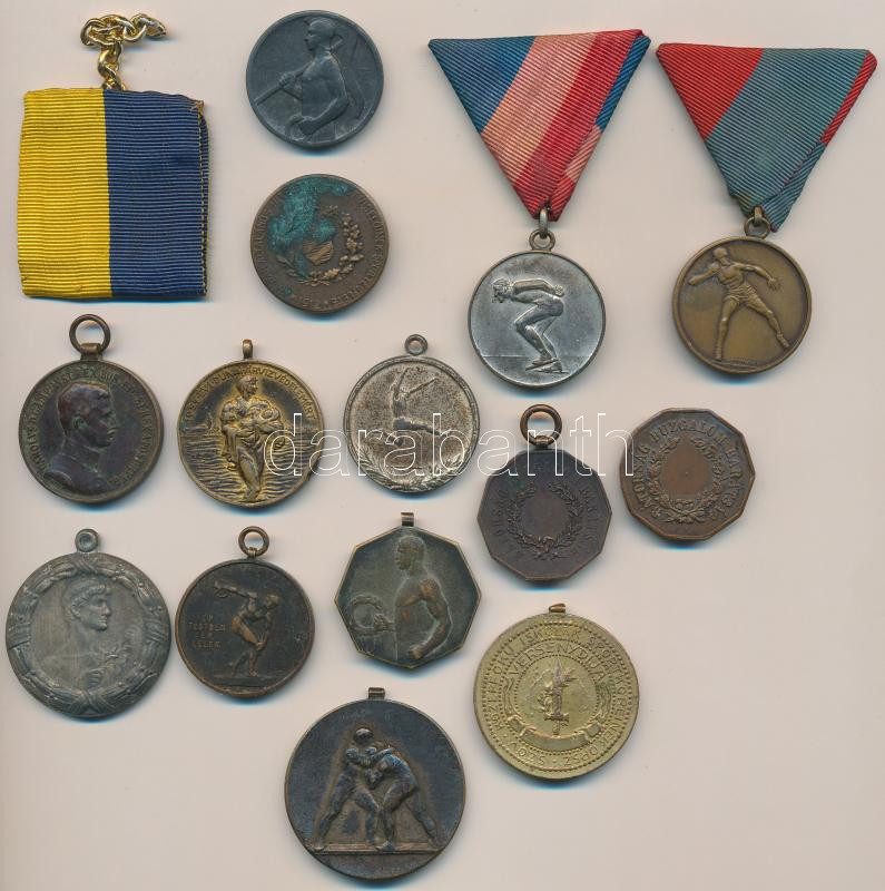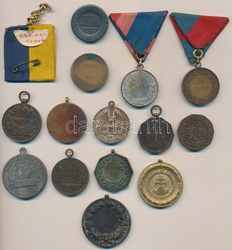 14db-os vegyes magyar sportérem és kitüntetés tétel, közte Berán Lajos (1882-1943) 1944. "Ferencz Városi Torna Club" fém díjérem (30mm); ~1910. "Magyar Testgyakorlók Köre Verseny Díj / Bátorság Buzgalom Barátság" Br sportérem (29mm); 1917. "Károly Bronz Vitézségi Érem" Br kitüntetés mellszalag nélkül. Szign: Kautsch T:vegyes