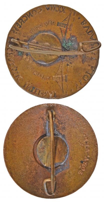 1938. "XXXIV. Nemzetközi Eucharisztikus Kongresszus Budapest" 2db fém jelvény, egyik zománcozott, hátoldalán "TÖRV. VÉD." jelzéssel, másik Madarassy Walter szignóval (22,5mm) T:2