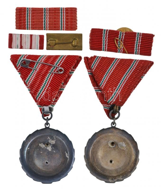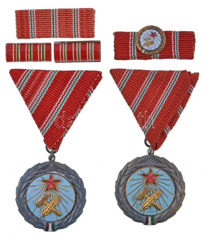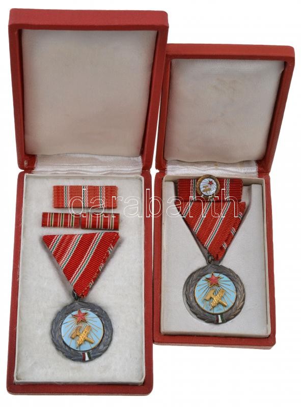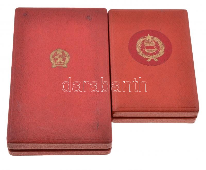 Beschreibung: 1954. "Munka Érdemérem" (2x) zománcozott Br kitüntetés mellszalagon, egyik Rákosi-címeres tokban szalagsávval, a másik Kádár-címeres tokban miniatűrrel szalagsávon T:2
