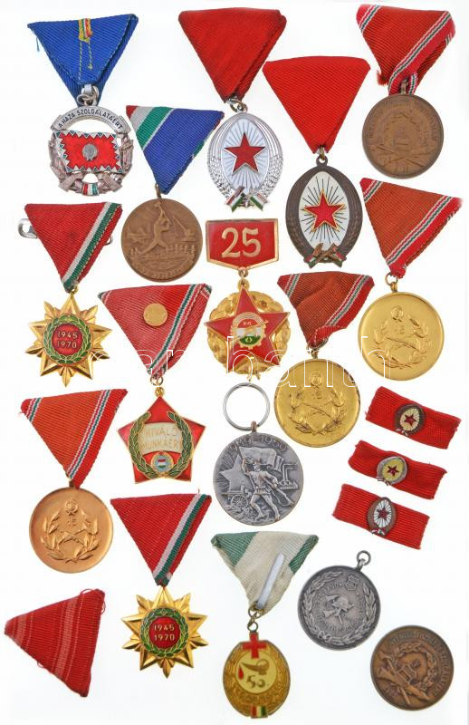 Beschreibung: 19db-os vegyes szocialista kitüntetés, szalagsáv tétel, közte 1959. "Tanácsköztársasági Emlékérem" ezüstözött Br érem mellszalaggal, 1985. "Munka Érdemrend" ezüst fokozata, ezüstözött és zománcozott Br kitüntetés mellszalagon, miniatűrrel szalagsávon T:vegyes