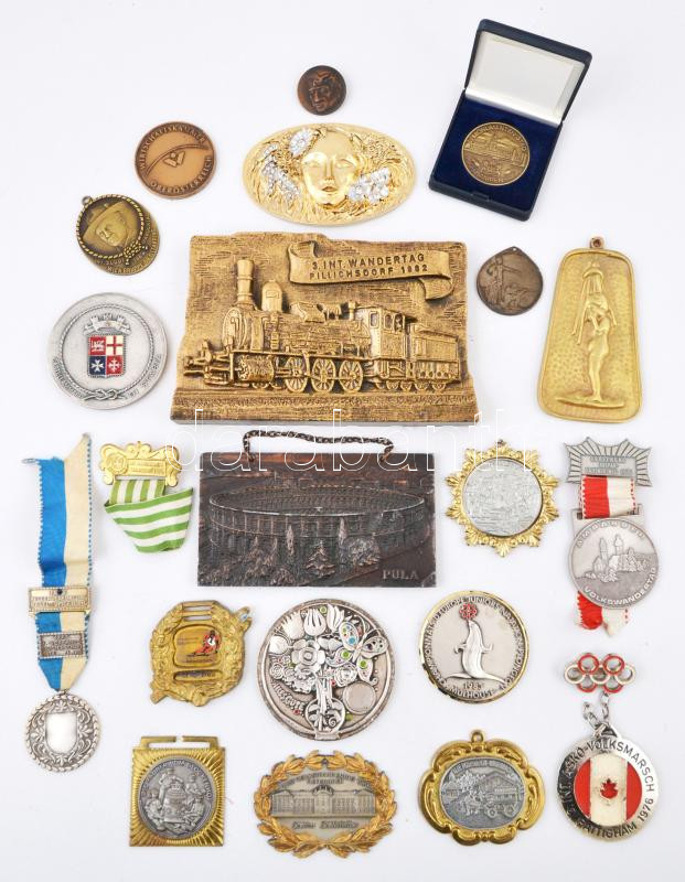 20db-os külföldi jelvény, érem és plakett tétel, főleg osztrákok, benne "3. Int. Wandertag Pillichsdorf 1982", "Ampasser Volkswandertag", "Alte Poststation Magerbach", "Pula", "Hohensalzburg", "Int. Scout Wandertag - Wien Gruppe 56 Ottakring", "3. Int. Askö-Volksmarsch Pattigham 1976 / Olympiade Montreal" T:2 20pcs of badges, medallions and plaques, mostly Austrian pcs, between them "3. Int. Wandertag Pillichsdorf 1982", "Ampasser Volkswandertag", "Alte Poststation Magerbach", "Pula", "Hohensalzburg", "Int. Scout Wandertag - Wien Gruppe 56 Ottakring", "3. Int. Askö-Volksmarsch Pattigham 1976 / Olympiade Montreal" C:XF