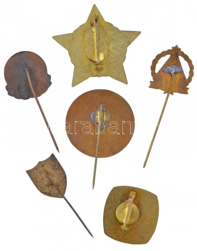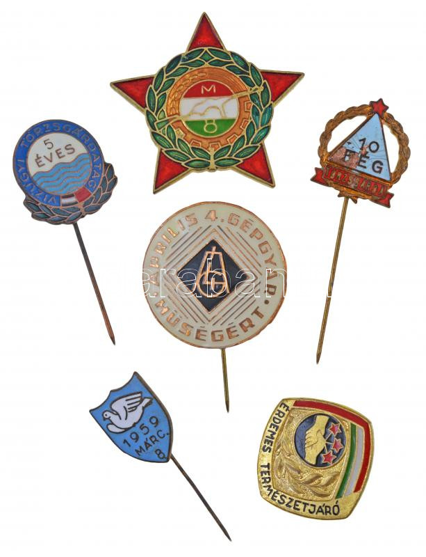 Beschreibung: 6db-os vegyes jelvény, kitűző tétel, közte "Érdemes természetjáró", "Munkásőr" zománcozott jelvények T:2,2- közte zománchibás is