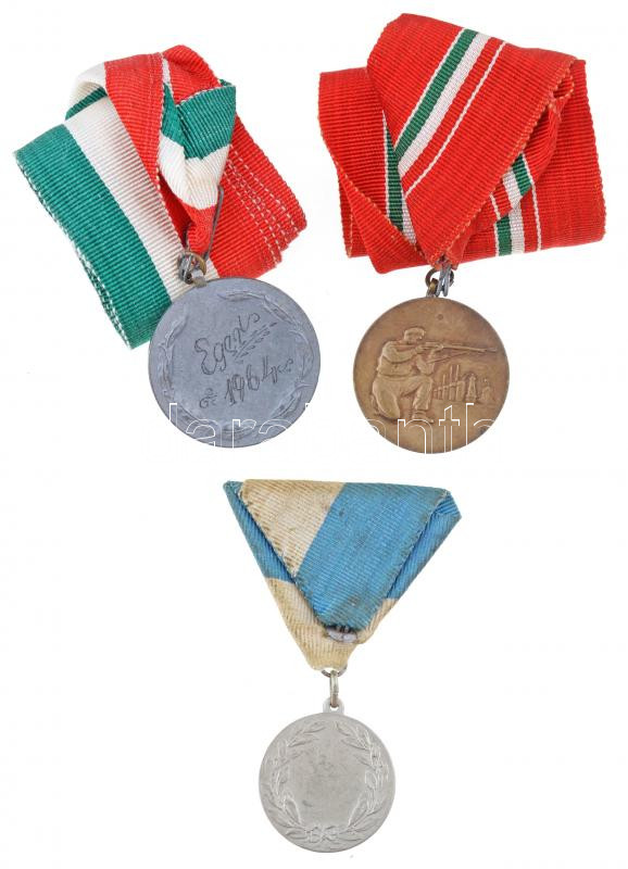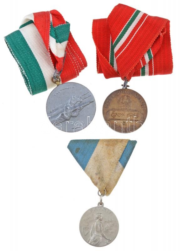 ~1930-1940. "PATRIA" ezüstözött Br sportérem mellszalagon, "ARKANZAS BUDAPEST" gyártói jelzéssel (30mm) + 1964. "Magyar Szabadságharcos Szövetség - Eger 1963 II." fém lövész díjérem szalagon (35mm) + 1964. "Eger 1964" ezüstözött fém lövész díjérem szalagon (39mm) T:2