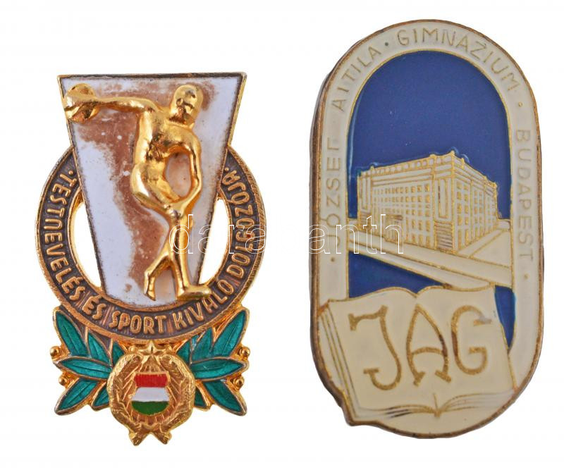 ~1970-1980. "József Attila Gimnázium Budapest" fém jelvény + "Testnevelés és Sport Kiváló Dolgozója" aranyozott, zománcozott fém jelvény T:2