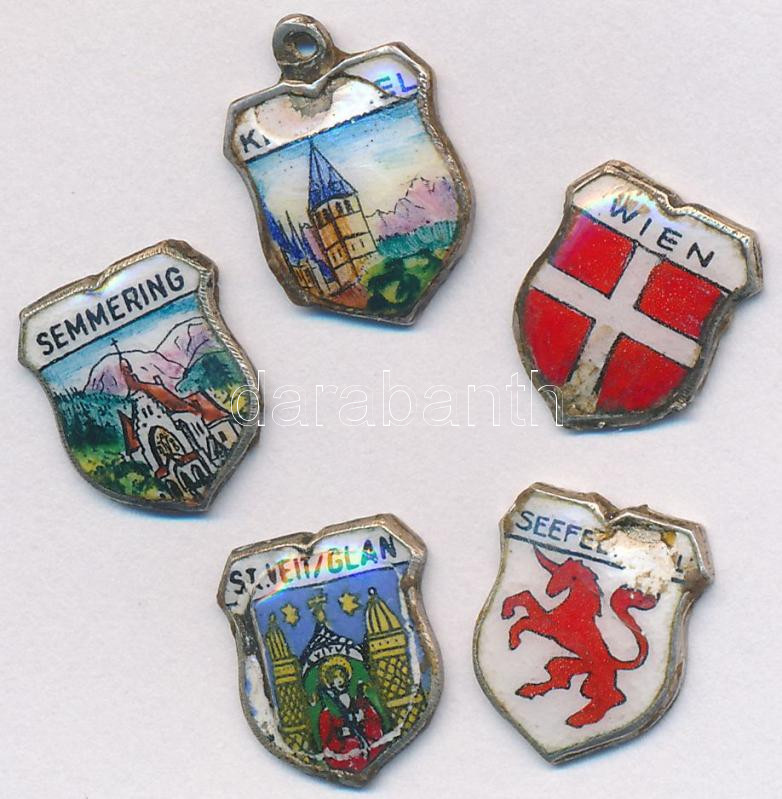 Ausztria DN 5db klf tűzzománcozott, jelzett Ag jelvény osztrák városokról (1g/0.800) T:2,2- zománchiba Austria ND 5pcs of diff enamelled, marked Ag badges about Austrian cities (1g/0.800) C:XF,VF enamell error