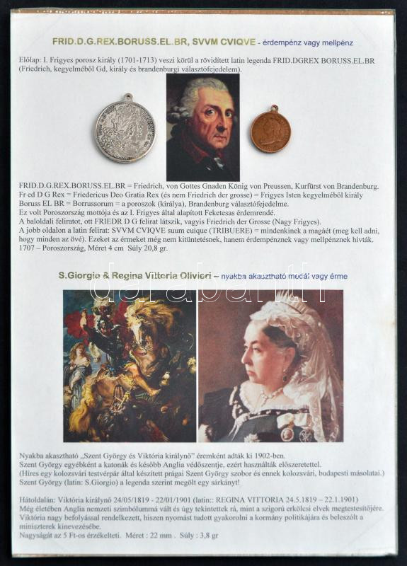 Nagy-Britannia ~1900. "Viktória királynő / Szent György" Br medál füllel, bekeretezett tájékoztatóval (22mm) + "I. Frigyes porosz király" fém emlékérem replikája füllel (33mm) T:2,2-