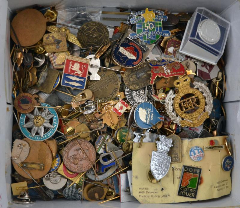 Nagy doboznyi vegyes külföldi jelvény tétel, benne sok zománcozott T:vegyes