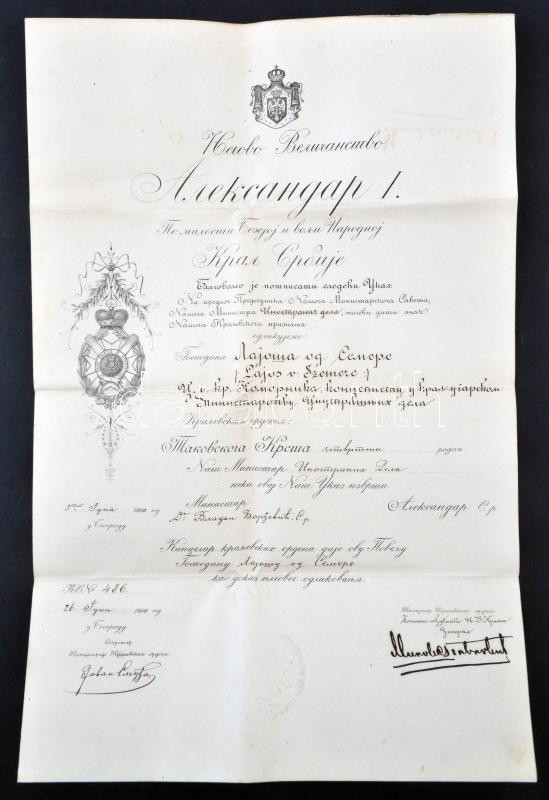 Szerbia 1900. "Takovo-rend IV. osztály" kitüntetés adományozói okirata, "Szemere Lajos" számára adományozva, szárazpecséttel, hátoldalán 30f bélyeggel és "Magyar Királyság Külügyminiszteri Elnökség" bélyegzéssel T:III szép papír