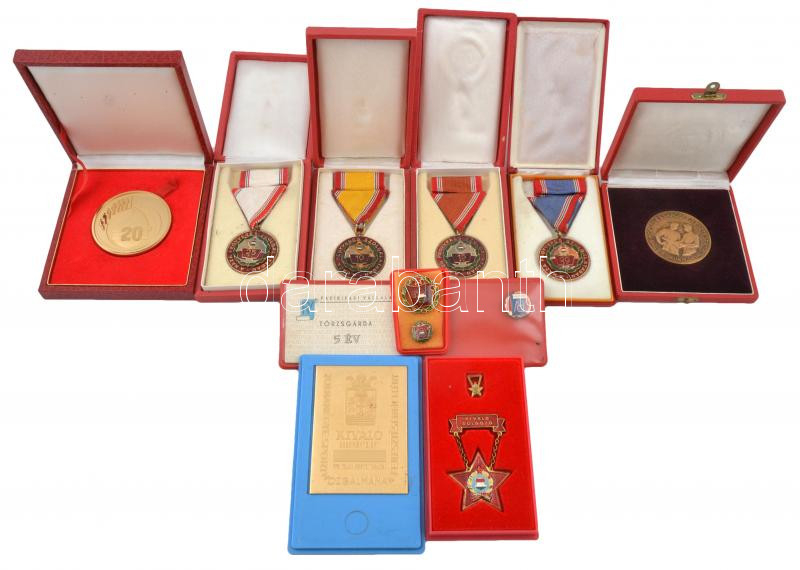 10db-os vegyes magyar szocialista jelvény és emlékérem tétel, mindegyik tokban, közte DN "Bács-Kiskun M. Tanács - Község és városfejlesztésért" Br emlékérem dísztokban (50mm); ~1960-1970. "A Haza Fegyveres Szolgálatlában" 10,15,20 és 25 év után, zománcozott fém kitüntetés mellszalaggal tokban T:vegyes