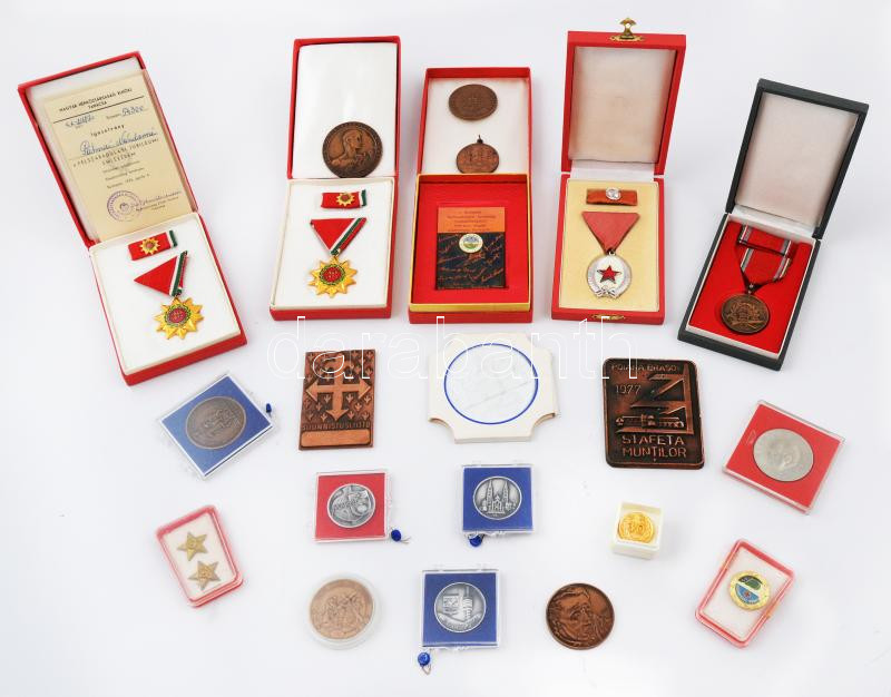 19db-os vegyes magyar és külföldi emlékérem, kitüntetés és jelvény tétel, közte 1964. "Munka Érdemrend" ezüst fokozata, zománcozott és ezüstözött Br kitüntetés mellszalagon, szalagsávval és miniatűrrel dísztokban, DN "Herend" jelzett herendi porcelán érem (67mm) T:vegyes