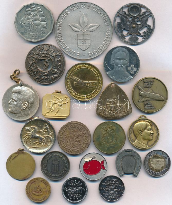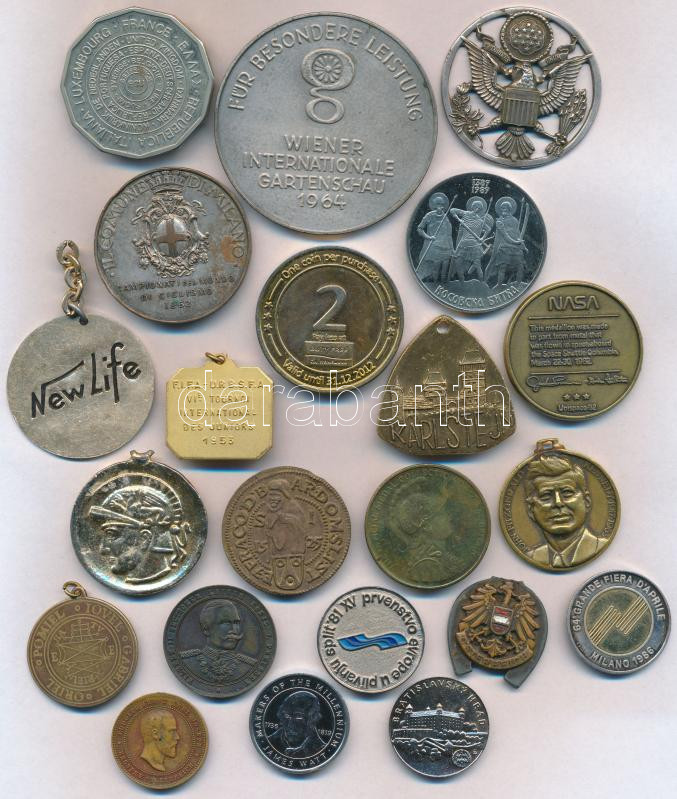 22db vegyes külföldi emlékérem, medál, jelvény, közte Austria 1889. "Rudolf trónörökös halálára" Br zseton. "RUDOLPH FRANZ KARL JOSEPH - KRONPR. V. OESTERREICH / GEB. D. 21. AUG. 1858- GEST. D. 30. JAN. 1889" (26mm) T:vegyes