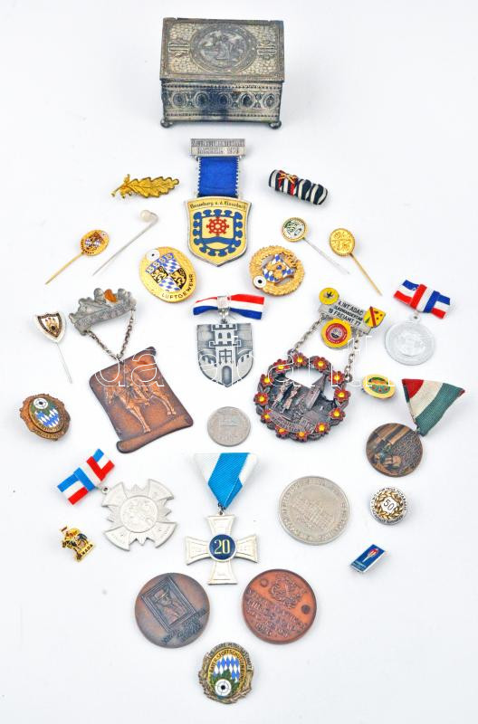 27db-os vegyes magyar és külföldi kitüntetés, jelvény, emlékérem, fémpénz tétel kis vasdobozkával, közte Lapis András (1942-) / Szabó Géza (1939-) 1996. "MÉE Kecskeméti Csoport - 100 éves a kecskeméti Katona József Színház / Numizmatikai 'Hírös Nap' Kecskemét 1996" Br emlékérem (42,5mm) , NSZK / Bajorország ~1950. "BSSB (Bajor Sportlövész Egysület) - Légpuska / Senior" aranyozott, zománcozott jelvény "J. ASCHKA MÜNCHEN" gyártói jelzéssel (45x34mm), ~1970. 225 éves tagság a Bajor Sportlövész Egyesületben" zománcozott Br jelvény (32,5x31mm) T:vegyes