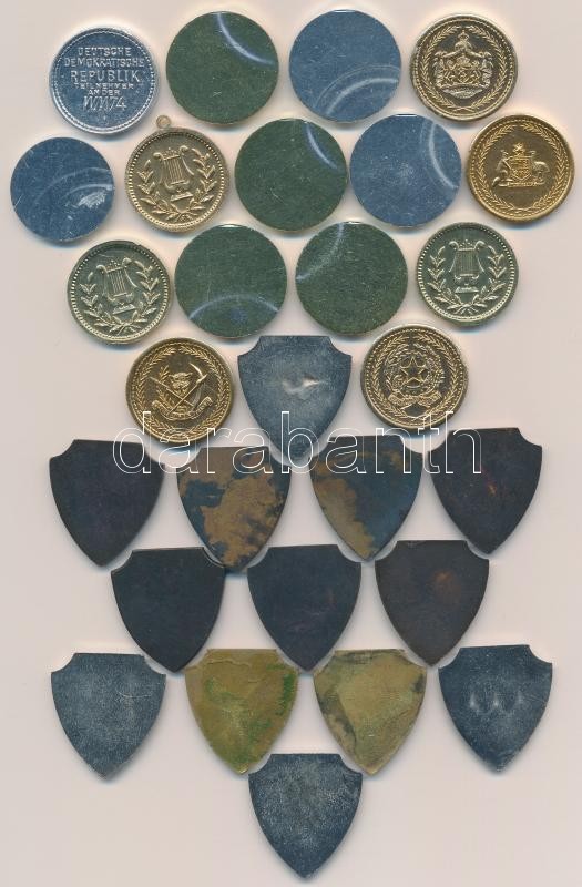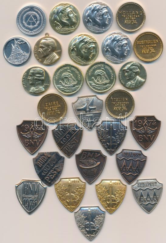 Beschreibung: 28db vegyes magyar és külföldi jelvény, zseton, közte "BNV (Budapesti Nemzetközi Vásár)" fém jelvények T:2,2-
