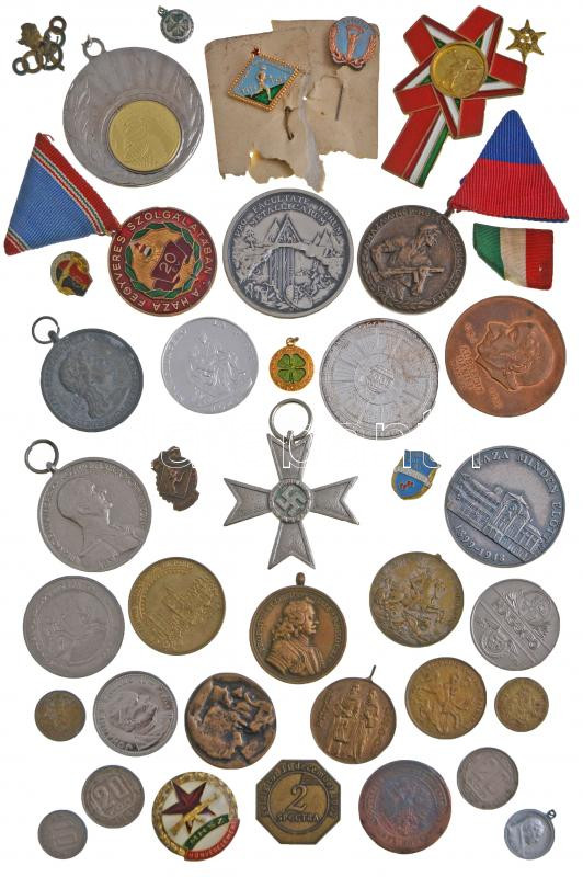 38db-os vegyes numizmatikai tétel, emlékérmekkel, kitüntetésekkel és pénzérmékkel, közte 1938. "Felvidéki Emlékérem - II. Rákóczi Ferenc" Br emlékérem mellszalag nélkül, 1949. "Nehézipari Műszaki Egyetem Bányamérnöki Kar 1735-1949" ezüstözött fém emlékérem (46mm), ~1960-1970. "MHSZ Honvédelemért" zománcozott fém jelvény T:vegyes