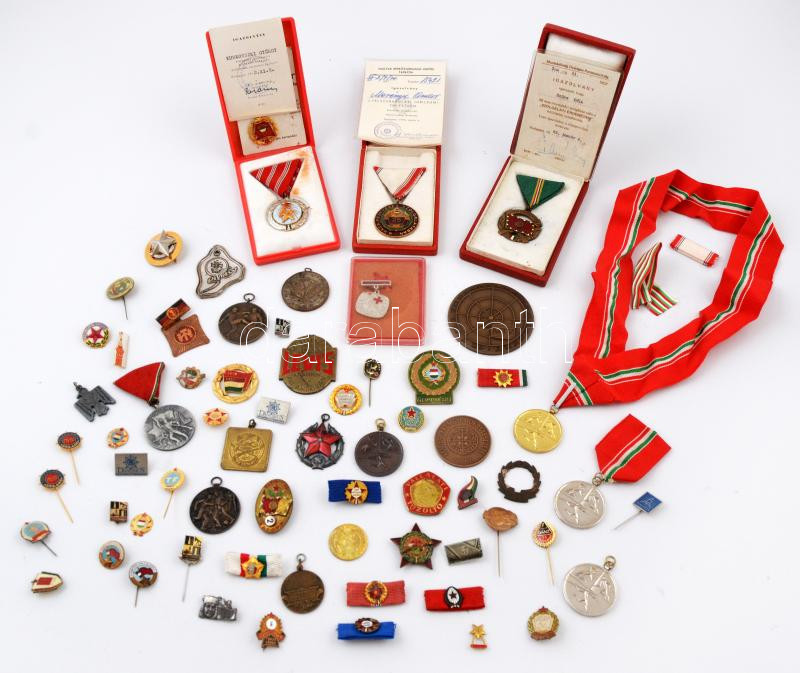Beschreibung: ~70db-os vegyes, főleg szocialista kitüntetés, igazolvány, jelvény, díjérem tétel, közte 1954. "Munka Érdemérem" zománcozott Br kitüntetés mellszalagon, tokban T:vegyes