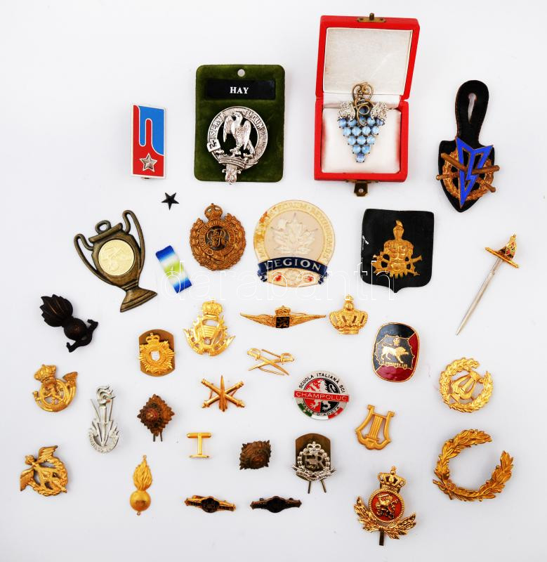 32db-os vegyes külföldi jelvény és kitűző tétel, főleg militária, közte Nagy-Britannia DN "Királyi Műszaki sapkajelvény" fém jelvény; "Királyi Tüzérség" fém jelvény T:vegyes