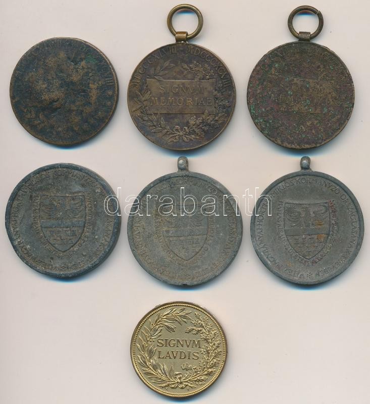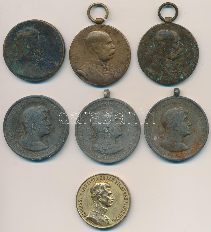 7db-os vegyes magyar kitüntetés tétel, közte 1917. "Károly Bronz Katonai Érdemérem a katonai érdemkereszt szalagján" aranyozott Br kitüntetés mellszalag nélkül valamint hiányzó koronákkal, "BRONZE" jelzéssel a peremen. Szign.: Kautsch; 1940. "Erdélyi részek felszabadulásának emlékére" cink emlékérem mellszalag nélkül. Szign.:BERÁN T:vegyes