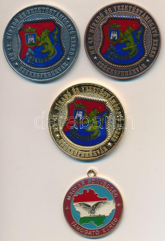 Beschreibung: DN "MH 43. Híradó és Vezetéstámogató Ezred - Székesfehérvár" (3xklf) aranyozott, ezüstözött és Br emlékérem (42,5mm) + "Magyar Honvédség - Támogató Ezred" zománcozott fém jelvény füllel (34mm) T:1-,2