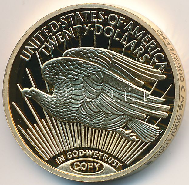 USA 1933. 20 Dollars "Double Eagle" gilt Ag replica coin with certificate and information (10g/0.999) C:PP