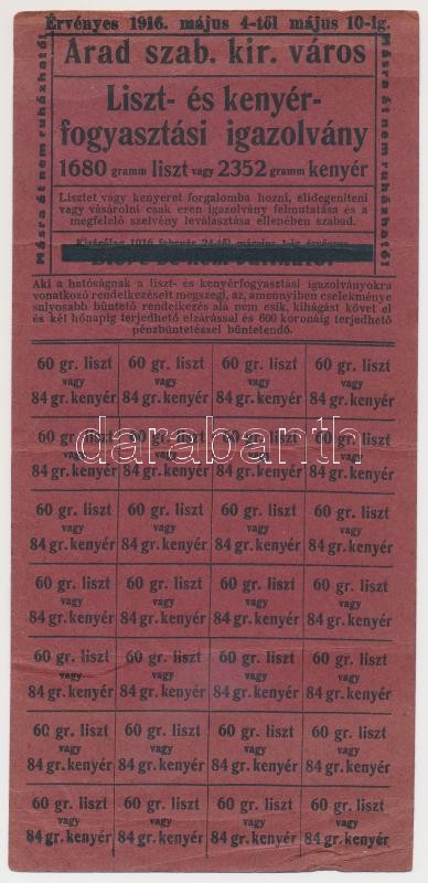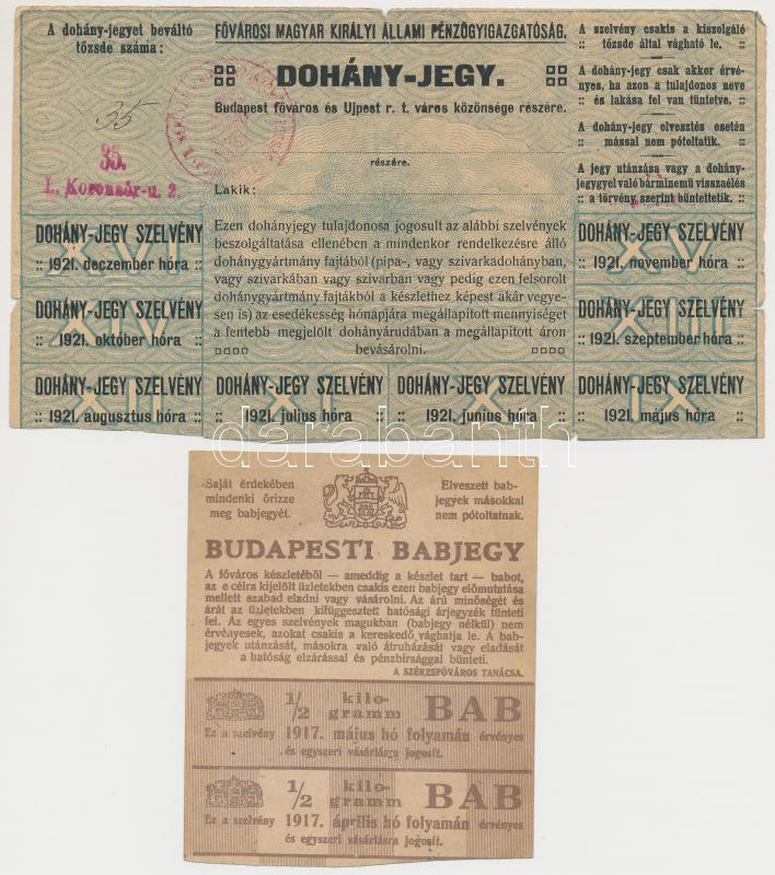 1916-1921. "Fővárosi Magyar Krályi Állami Pénzügyigazgatóság Dohány-jegy" bélyegzésekkel, "Budapesti babjegy", "Arad szab. kir. város liszt- és kenyérfogyasztási igazolvány" T:III