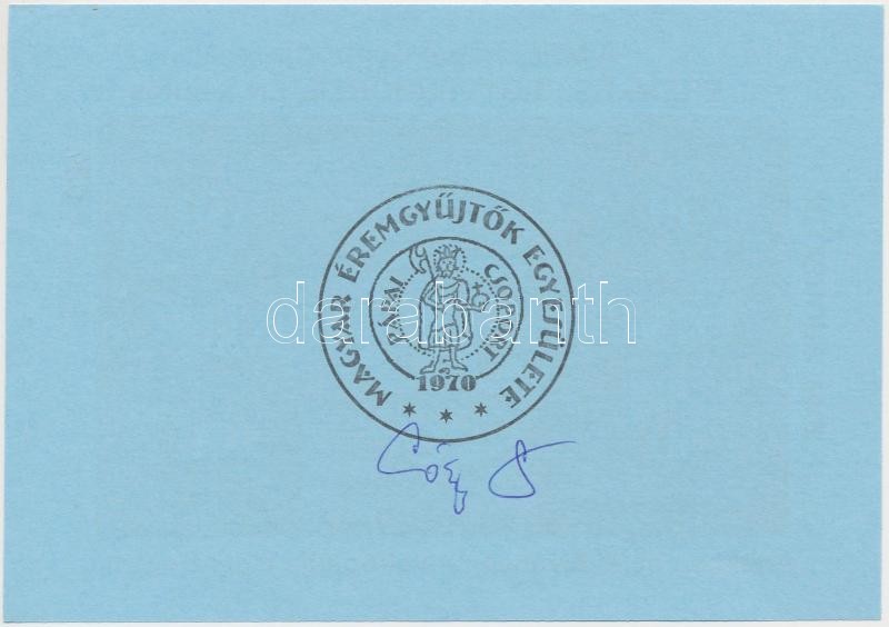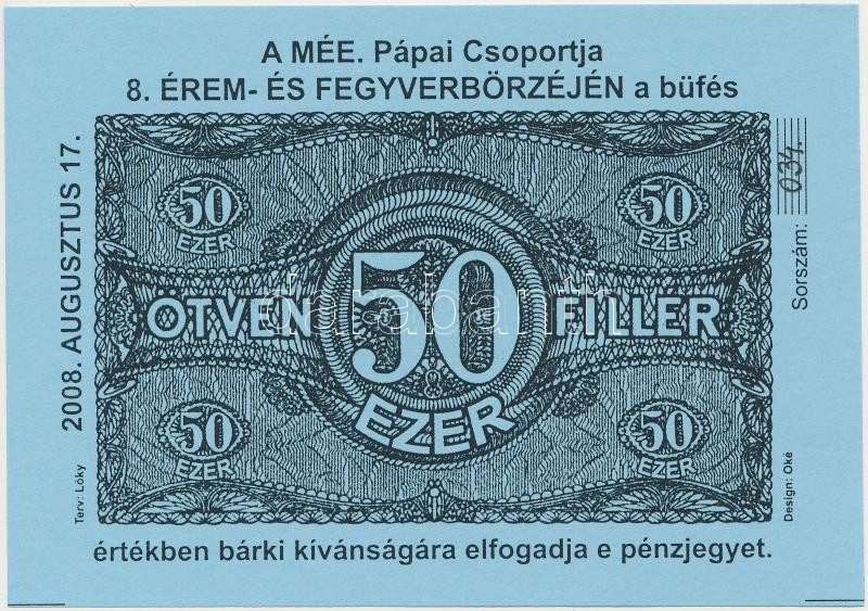 Pápa 2008. "A MÉE Pápai Csoportja 8. Érem- és Fegyverbörzéje" 50.000f alkalmi pénz, "034" sorszámmal, hátlapján "Magyar Éremgyűjtők Egyesülete - Pápai Csoport 1970" felülbélyegzéssel, a tervező Lóky aláírásával T:I-