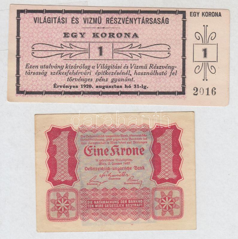 Székesfehérvár 1920. 1K "Világítási és Vízmű Részvénytársaság&quo... https://www.darabanth.com/de/262-Fernauktion/262.0/Numismatik/Notgelden~200007/Szekesfehervar-1920-1K-Vilagitasi-es-Vizmu-Reszvenytarsasag-utalvany-plus-Osztrak-Mag~II1302687